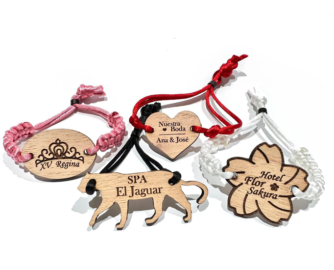 Estos brazaletes hechos a mano son la opción perfecta tanto para promoción como para seguridad. Su diseño incluye una placa de madera completamente personalizable en forma y medida, ideal para destacar tu marca o evento. Incorporan un broche de seguridad para garantizar el control de acceso. Diseñados para ser llamativos y duraderos, son ideales para eventos exclusivos.